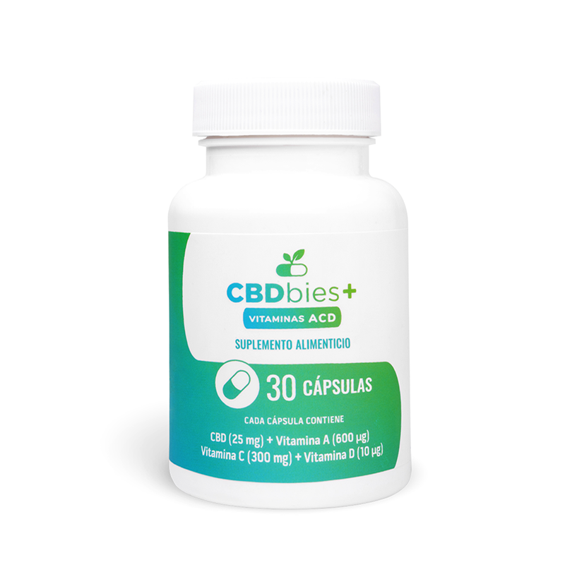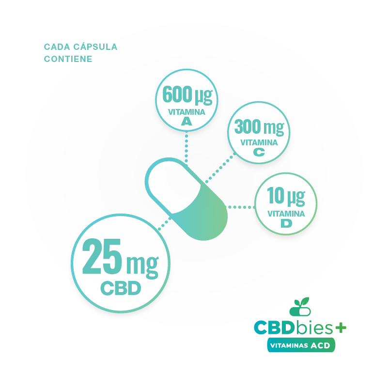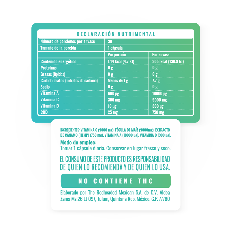 Bote con 30 cápsulas que contienen 25 mg de cannabidiol o CBD derivado del Hemp más 600 µg de Vitamina A, 300 mg de Vitamina C y 10 µg de Vitamina D.